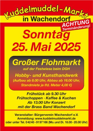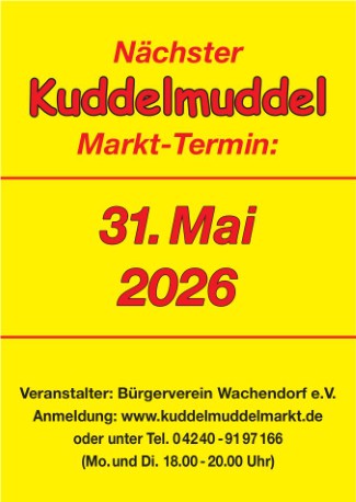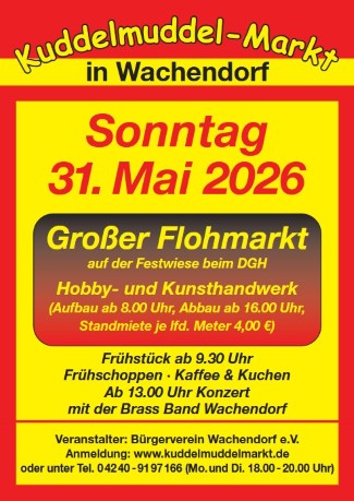 Die Idee des Kuddelmuddel-Marktes entstand nach Gründung des Bürgervereins Wachendorf 2003. Es wurden Einnahmequellen gesucht, um örtliche Projekte finanziell zu unterstützen. Da sich das Gelände rund um das Dorfgemeinschaftshaus dafür anbot, fand 2004 der erste Kuddelmuddel-Markt mit 40 Beschickern statt. Im folgenden Jahr hatte sich die Zahl bereits verdoppelt. Inzwischen kommen bis zu 150 Standbetreiber zu unserem Markt.